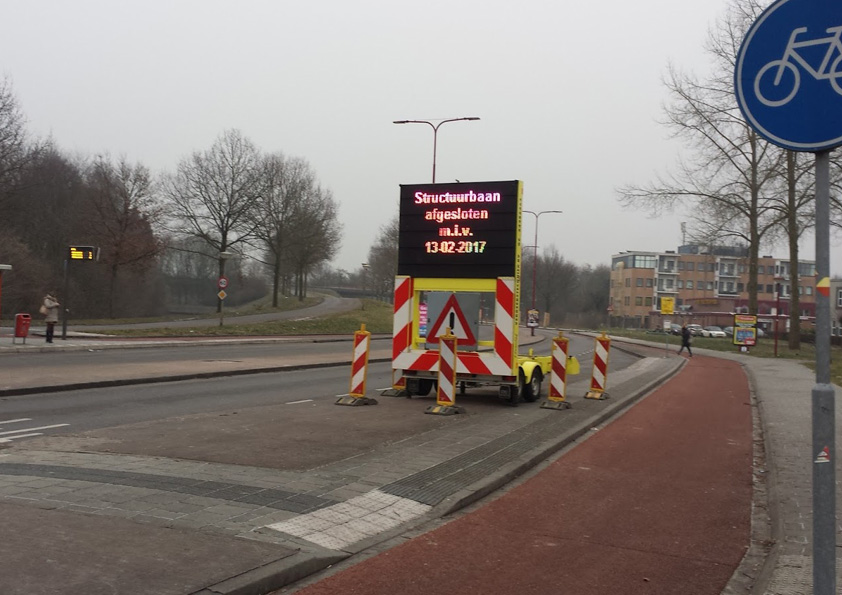 Tijdens de werkzaamheden, die tot medio juli duren, is de Structuurbaan afgesloten voor alle verkeer, dus ook voor fietsers. Een flitsende tekstkar geeft dat al een week aan. Kosten noch moeite zijn gespaard om tijdelijke bushaltes langs de Plettenburgerbaan en trappen voor voetgangers aan te leggen, maar de informatie voor fietsers blijft beperkt tot een enkel geel F-bordje.
