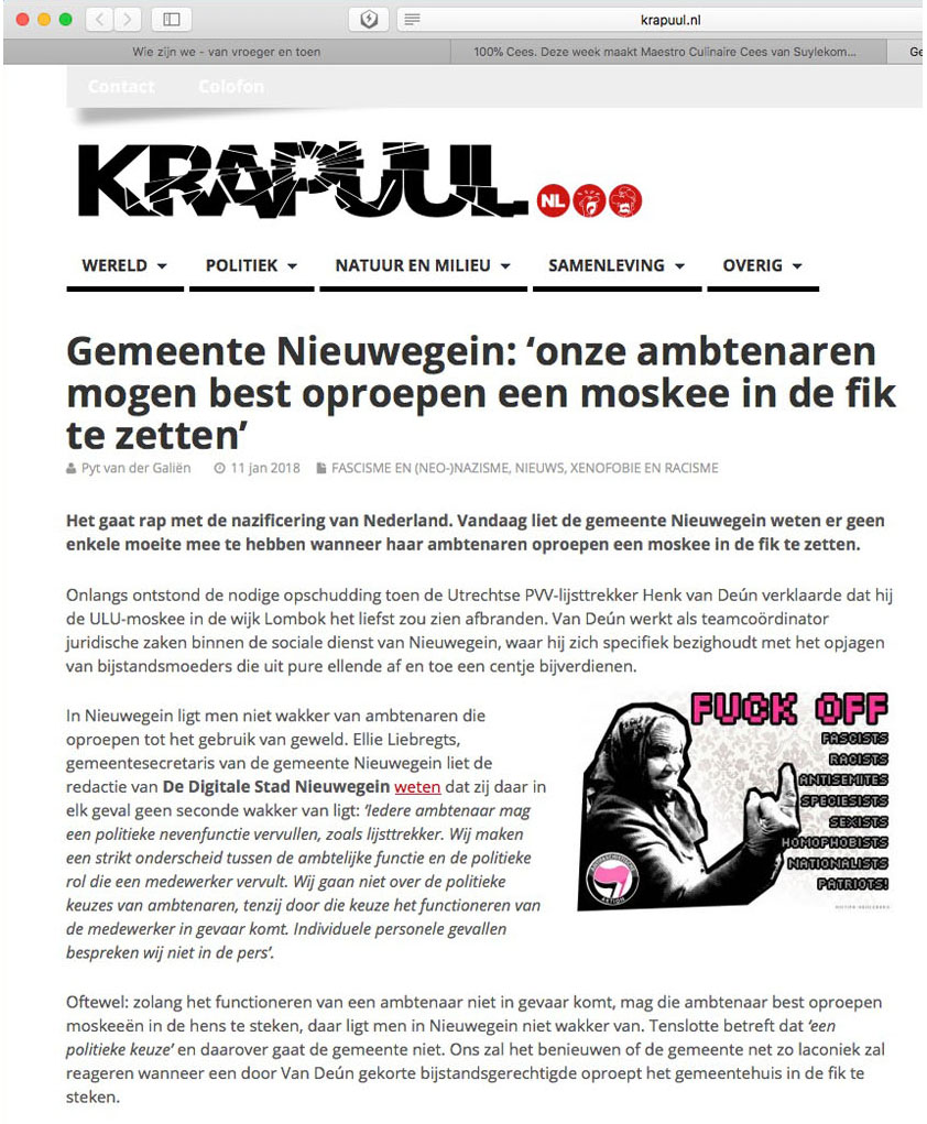 De Utrechtse PVV-lijsttrekker Henk van Déun, die werkzaam is bij de gemeente Nieuwegein als teamcoördinator juridische zaken binnen de sociale dienst van Nieuwegein, zal niet door de gemeente op de vingers worden getikt vanwege zijn uitspraak over het in brand steken van een moskee. Onlangs liet hij in een radioprogramma weten dat hij de ULU-moskee in de wijk Lombok liever zou zien afbranden. De ULU-moskee in Utrecht vindt de uitspraken die de Utrechtse PVV-lijsttrekker Van Deún ‘ingrijpend en zorgwekkend’