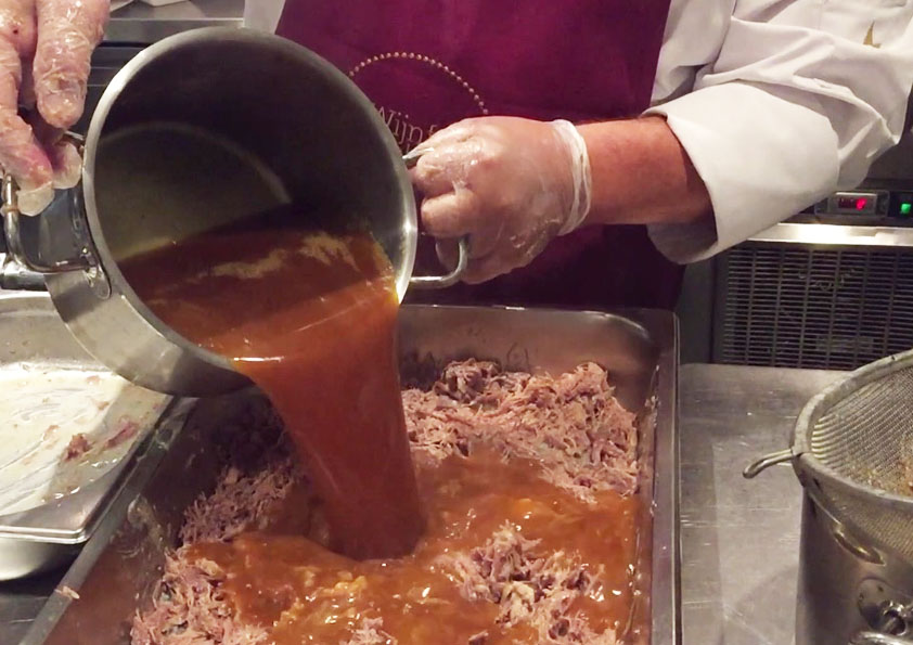 Van het braadvocht maken we de saus. Plm. 300 ml voor vier personen. Haal het vocht uit de ovenschaal en voeg daarbij: