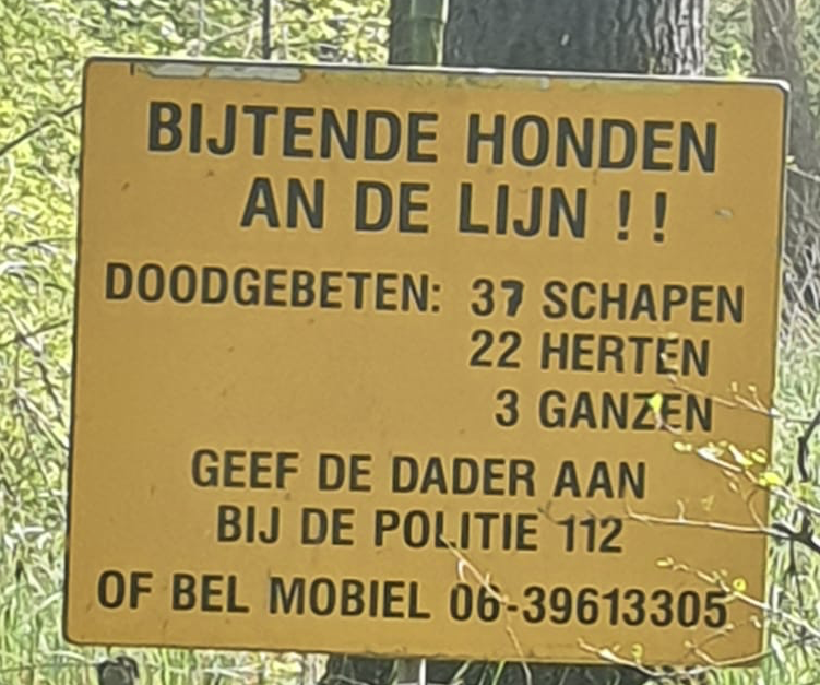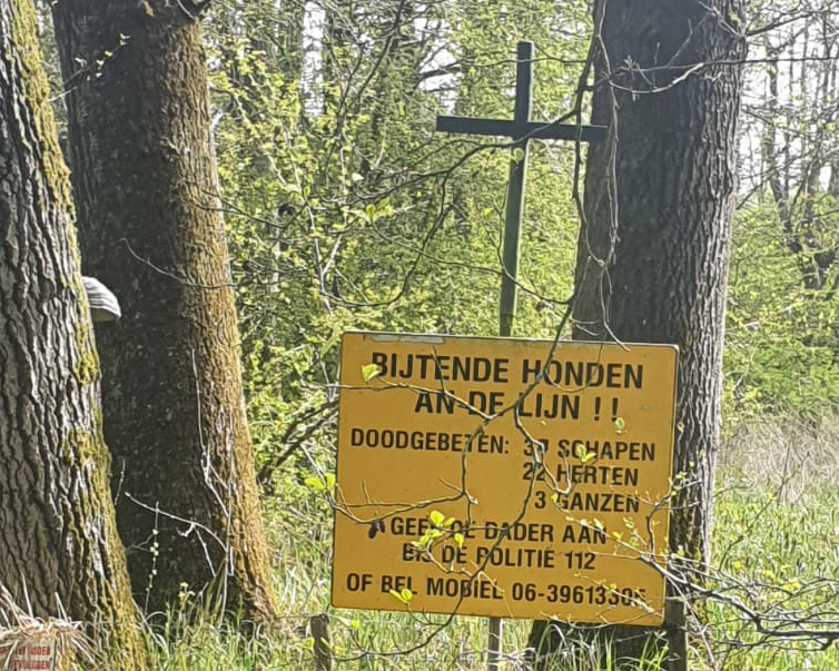 Ruud van Engelen: ‘Ik heb deze borden geplaatst uit onmacht. Er wordt niets gedaan om de overmacht aan honden in dit gebied tegen te gaan. De aanvallen op mijn schapen in het bos liep de spuigaten uit. In een lange periode ben ik meer dan 150 schapen en lammeren kwijt geraakt die doodgebeten zijn door de honden. Het gebeurd nog steeds. De schapen waren mijn grasmaaiers, maar niet alleen mijn schapen zijn de dupe, ook herten en fazanten worden gepakt. Momenteel loopt er nog maar één hert, wat fazanten en twee pauwen rond in dit gebied.’ Van Engelen hoopt dat deze dieren niet gepakt en doodgebeten worden door de honden.
