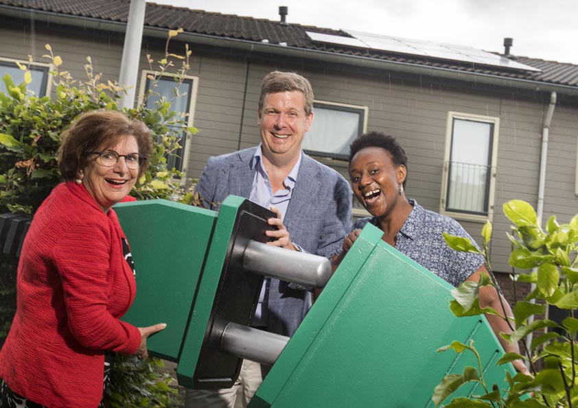 Marlies Krol (Portaal), Erik Snijders (KiesZon) en de huurder van Portaal op wiens dak het 500ste zonnesysteem is geplaatst.