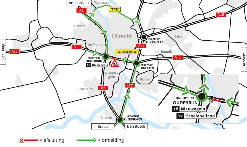 Verkeer vanuit Amsterdam richting Arnhem wordt omgeleid via de A1 en A27/A30 en verkeer vanuit Rotterdam via de A15. Bij Utrecht moeten weggebruikers omrijden via de N230 (de Noordelijke Randweg Utrecht) en de A27. Een andere mogelijkheid is omrijden via de A2 en de A27. Fietsers kunnen omrijden via de Galecopperdijk.