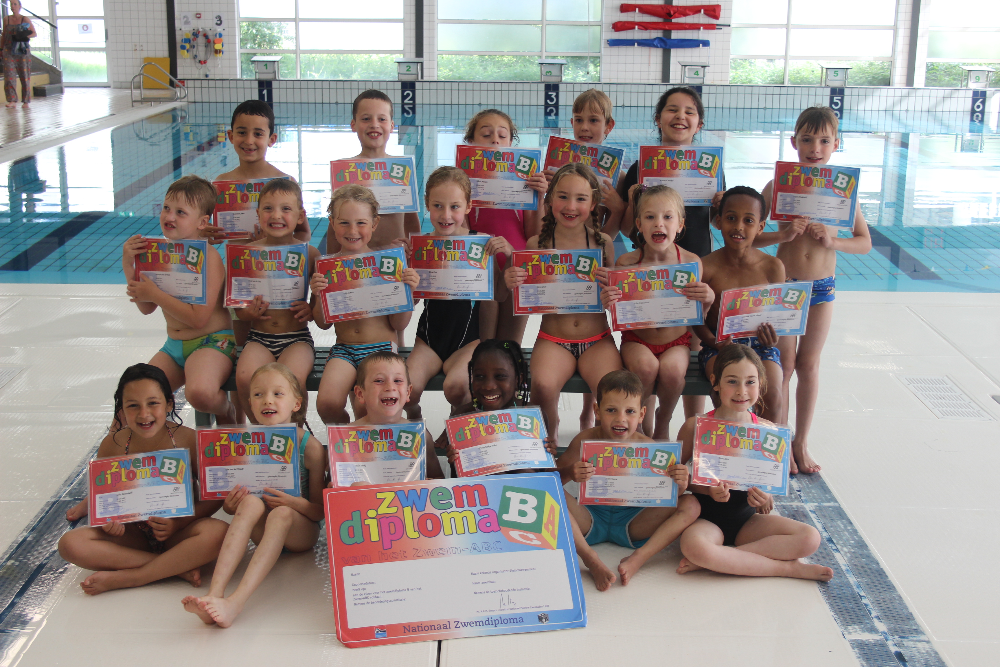Woensdag 31 mei 2017 werd er afgezwommen voor het B- diploma en was het enorm spannend voor een grote groep kinderen. Onder aanmoediging van ouders, broertjes, zusjes,opa’s en oma’s, zwommen zij af voor het tweede diploma van het zwem-ABC, namelijk het B – diploma. Alle kinderen deden enorm hun best. Het resultaat was dat iedereen is geslaagd! Op de foto’s de trotse kinderen met hun diploma:
