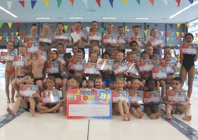 Woensdag 03 mei 2017 werd er afgezwommen voor het B- diploma en was het enorm spannend voor een grote groep kinderen. Onder aanmoediging van ouders, broertjes, zusjes,opa’s en oma’s, zwommen zij af voor het tweede diploma van het zwem-ABC, namelijk het B- diploma. Alle kinderen deden enorm hun best. Het resultaat was dat iedereen is geslaagd! Op de foto’s de trotse kinderen met hun diploma: