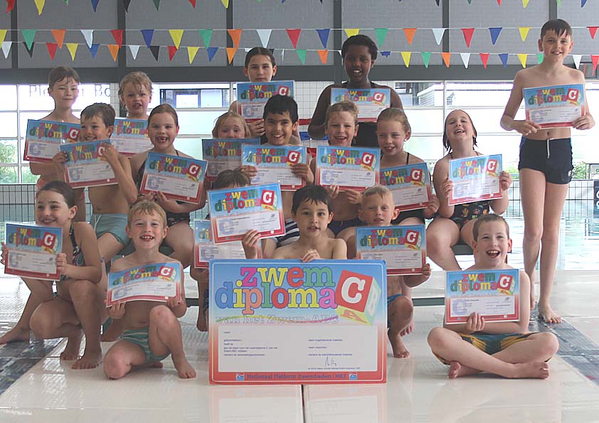 Woensdag 24 mei 2017 werd er afgezwommen voor het C-diploma en was het enorm spannend voor een grote groep kinderen. Onder aanmoediging van ouders, broertjes, zusjes,opa’s en oma’s, zwommen zij af voor het derde diploma van het zwem-ABC, namelijk het C – diploma. Alle kinderen deden enorm hun best. Het resultaat was dat iedereen is geslaagd! Op de foto’s de trotse kinderen met hun diploma: