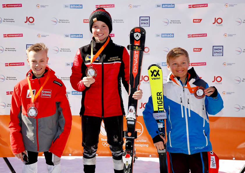 Jayden (midden) trots met zijn titel Nederlands Jeugd Kampioen Slalom skiën