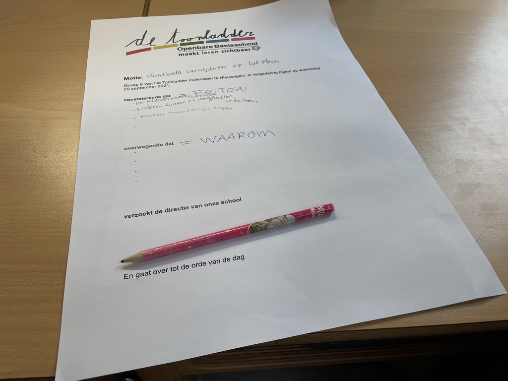 Het werd al snel duidelijk dat er veel behoefte is aan een uitdagender speelplaats. Daar krijgt de directeur nog een hele kluif aan, want de leerlingen gaan nog met de directeur in overleg over de gemaakte moties!