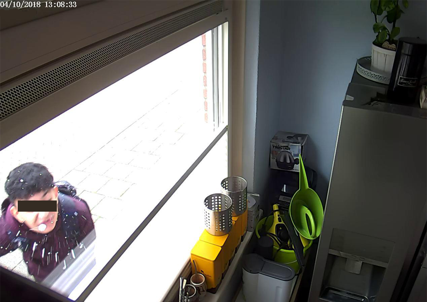 Een lichtgetinte scholier spuugt tegen het raam van een woning aan de Paukenlaan
