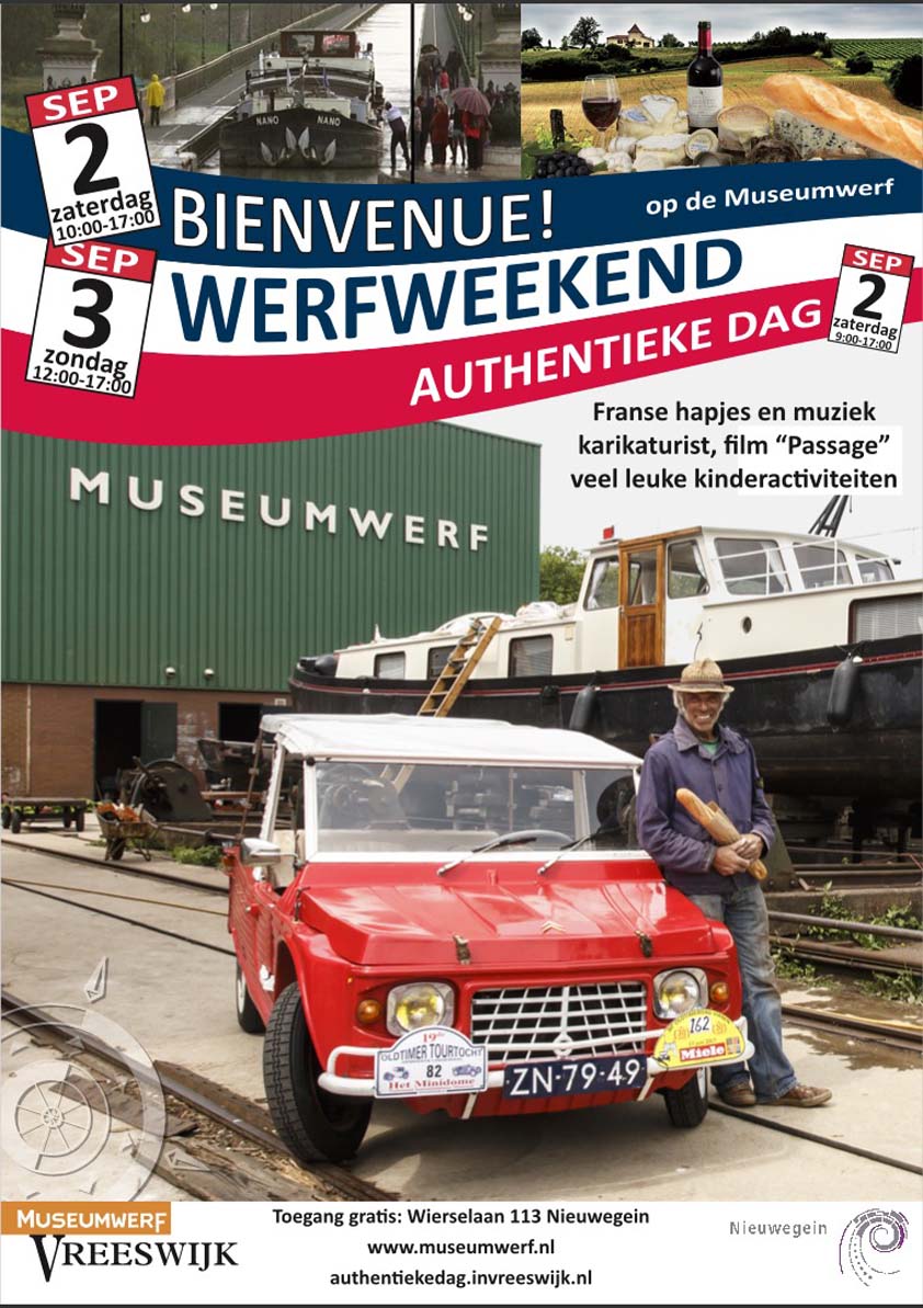 Bienvenue op de Museumwerf! vindt plaats op het rolstoelvriendelijke terrein van Museumwerf Vreeswijk aan de Wierselaan 113 in Nieuwegein (Vreeswijk). Aanmelden is niet nodig. Bienvenue op de Museumwerf is goed te combineren met de Authentieke Dag in Vreeswijk.