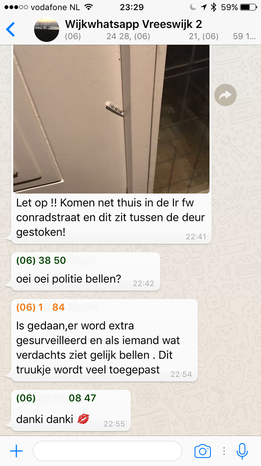 Buurtbewoners rondom de ingenieur F.W. Conradstraat in Vreeswijk laten weten dat het boevengilde in hun wijk actief is. Inbrekers hebben een truc om te zien of in een huis de bewoners thuis zijn: ze schuiven stukjes papier of takjes tussen de deur.