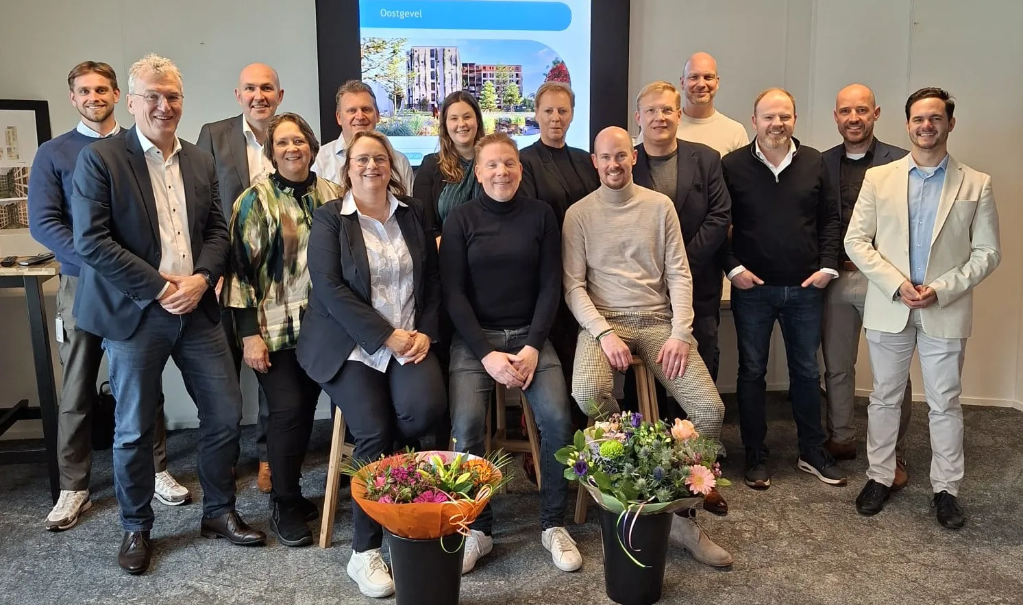 Foto: Samen met ING, aannemer VDL, adviesbureau AAG, Waarborgfonds voor de Zorgsector en leden van de stuurgroep en projectgroep werd de toekenning van de omgevingsvergunning alvast bescheiden gevierd.