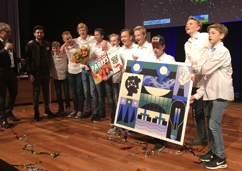 Met het idee voor de Multi-Molen heeft het Cals College de hoofdprijs in de wacht gesleept: een bezoek met tien leerlingen en twee docenten naar bijzondere locaties en mooie, technisch interessante projecten in Parijs. Daar nemen we ook een kijkje ‘achter de schermen’. De 2e prijs, een Ultimaker 3D printer, ging naar Tiny Garden van CS Walcheren. De derde prijs ging naar UnderWay van het CSG Bogerman uit Sneek: de betrokken leerlingen krijgen een jaarabonnement op het populairwetenschappelijke blad Know How.