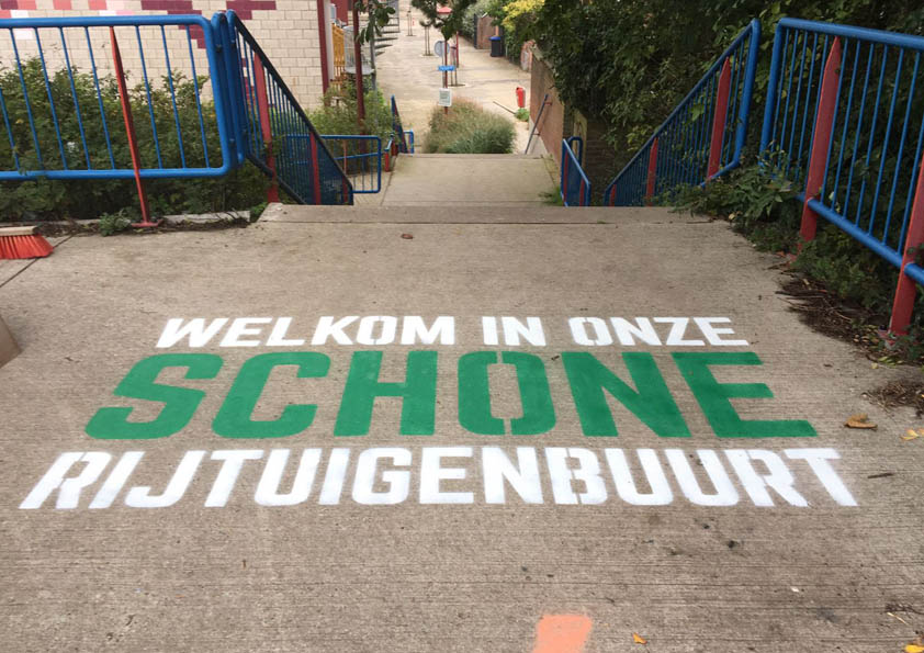 De afgelopen week zijn op verschillende plekken in de Rijtuigenbuurt in Batau zuid buurt grondschilderingen aangebracht bij afvalbakken, speelplekken en afvalcontainers. Dit had de gemeente al eerder willen doen maar wegens slechte weersomstandigheden werd het uitgesteld. De campagne vóór een schone buurt is onderdeel van het vernieuwingsplan van de Rijtuigenbuurt.