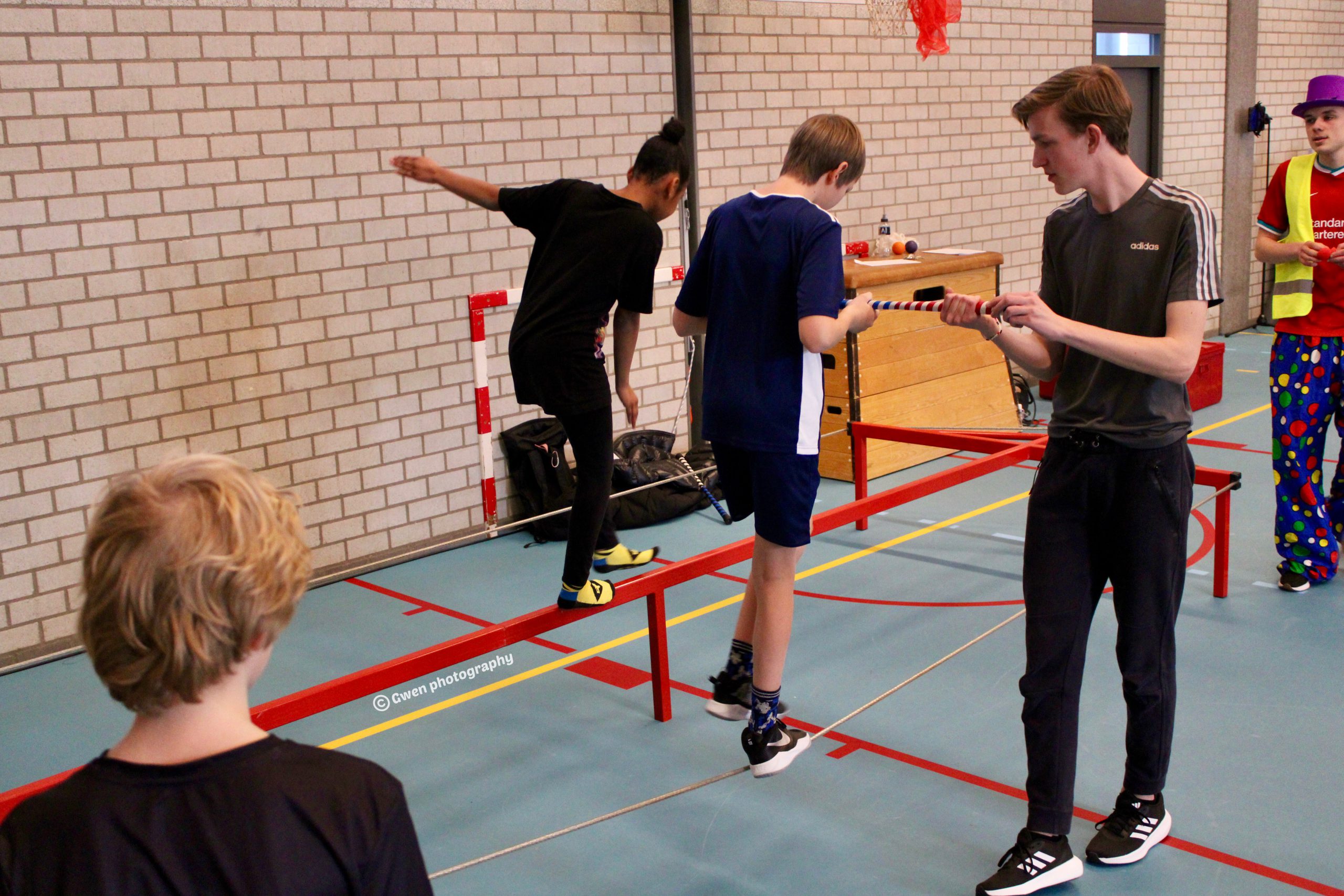 Op vrijdag 10 februari jl. was het een heel spannende dag voor de leerlingen van groep 8 van basisschool De Tandem en Koningin Beatrix. Zij waren uitgenodigd om te komen kijken naar de voorstelling Circus Circumflex die door vwo-6-leerlingen was gemaakt. Daarna werden de groep-8-ers door de vwo’ers begeleid om te oefenen met allerlei circusactiviteiten.