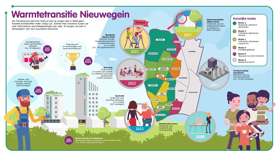 Uit onderzoek blijkt dat voor een groot deel van de gebouwen een collectieve oplossing het meest kansrijk is voor verwarming zonder CO2-uitstoot. Dat komt door de hoge bebouwingsdichtheid en de aanwezigheid van het bestaande warmtenet (51% van de woningen van Nieuwegein is aangesloten op de stadverwarming). Daardoor zijn de kosten voor een collectieve oplossing lager dan de kosten voor individuele oplossingen per gebouw. Er zijn voor alle gebieden mogelijke warmte- oplossingen in kaart gebracht. Voor alle wijken geldt: begin met energiebesparing, want die energie hoef je dan ook niet meer op te wekken.