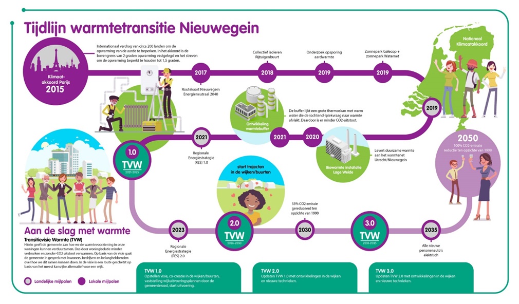 Het college van B&W heeft een plan voor duurzame warmte, ook wel Transitievisie warmte Nieuwegein genoemd, vastgesteld. In dit plan staat hoe de gemeente de komende 20 jaar onze huizen en gebouwen op een andere manier wil verwarmen, zonder aardgas. Ook staat in dit plan een voorstel met kansrijke buurten en projecten waar we al vóór 2030 een start mee willen maken. De Transitievisie Warmte is onderdeel van een landelijke afspraak (klimaatakkoord): heel Nederland stapt op termijn over op duurzame energie.