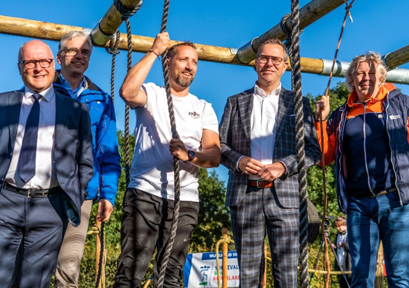 V.l.n.r. John van Engelen (wethouder Gemeente Nieuwegein), Ron Kruiswijk (voorzitter Atverni), Maarten Postema (voorzitter Kracht Survivalrun Nieuwegein), Marc van den Tweel (algemeen directeur NOC*NSF) en Cees van Rootselaar (sportcoördinator SportID Nieuwegein).