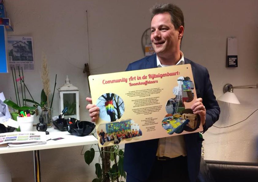 Wethouder Hans Adriani: ‘De Rijtuigenbuurt bruist van de creativiteit. Vorig jaar hadden we al de prachtige huishoge ekster van Carin Sleurink, afgelopen dinsdag mocht ik de knuffelbomen van Joyce Overheul en de picknicktafels van Vincent Skiller onthullen. Prachtige kunstwerken, ontstaan als Community Art.’