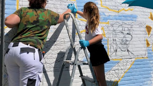 De afgelopen weken zette Carin de eerste hulplijnen op de muur aan de zijkant van de Albert Heijn. Nu is het de beurt aan de 30 vrijwilligers uit de buurt die Carin tijdens haar buurtcampings heeft verzameld. Zij gaan alle vakjes kleur geven zodat het echte ‘community art’ wordt.