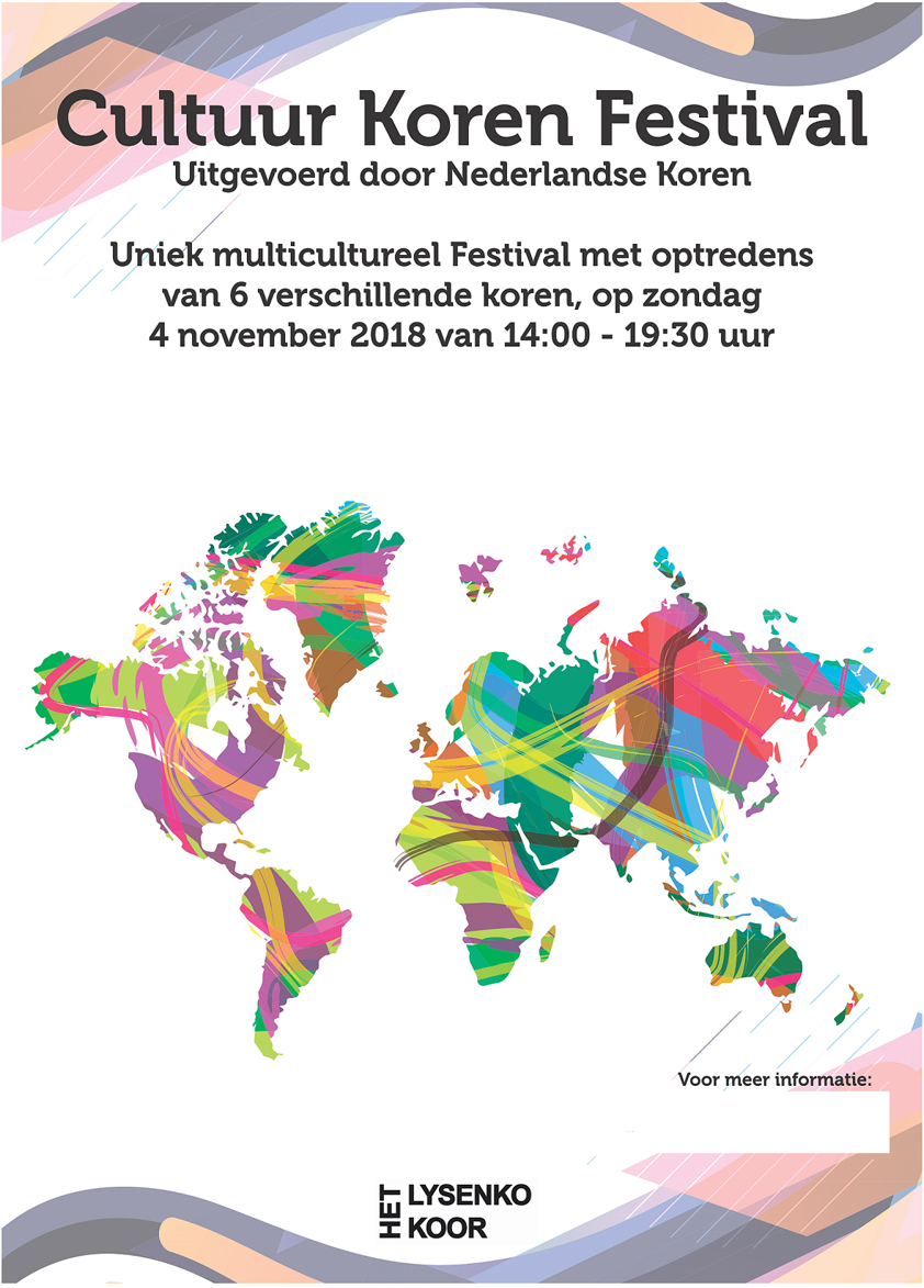 Op zondag 4 november vindt voor het eerst het ‘Cultuur Koren Festival’ plaats. In Theater DE KOM in Nieuwegein zullen die dag van 14.00 uur tot 19.30 uur diverse wereldmuziekkoren hun muziek ten gehore brengen. Het Lysenko Koor uit Nieuwegein is de organisator. Kaarten zijn a € 15,00 via Theater DE KOM te bestellen.