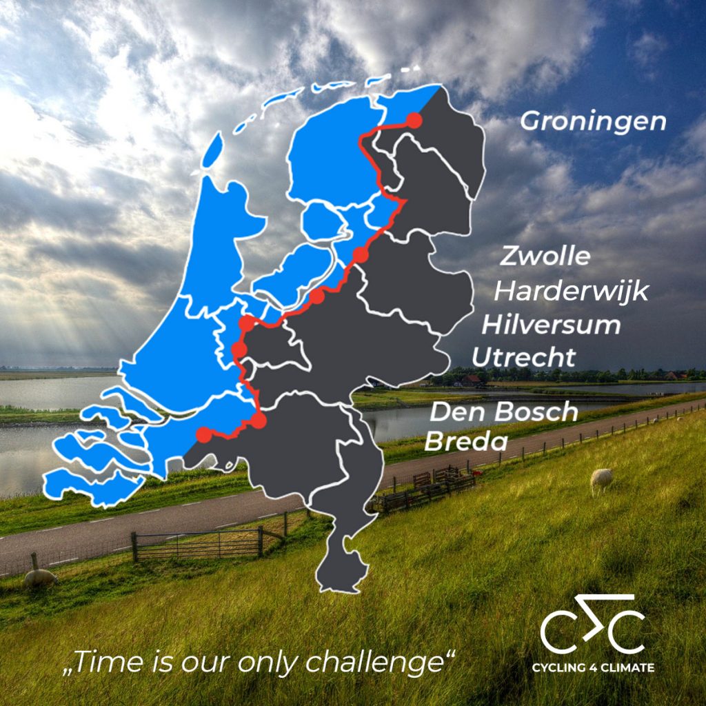 Op 22 juni 2020 fietst een groep van 30 bekende en minder bekende fiets- en duurzaamheidsliefhebbers bijna 400 kilometer. Een tocht langs de kustlijn die in Nederland ontstaat als de zeespiegel te ver doorstijgt. Een kustlijn die wat Cycling 4 Climate betreft nooit werkelijkheid mag worden. De tocht gaat ook dwars door Nieuwegein. Dit betekent dat als de zeespiegel te ver doorstijgt, ook Nieuwegein een badplaats gaat worden.