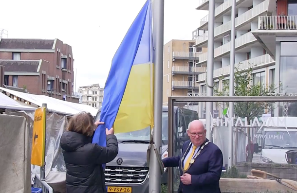 Na een korte toespraak van burgemeester Frans Backhuijs in het Stadshuis van Nieuwegein en een minuut stilte, is de Oekraiense vlag gehezen als steunbetuiging aan alle mensen die lijden onder de oorlog in Oekraïne. De vlag, die Frans Backhuijs samen met een inwoner uit Nieuwegein met een Oekraïense achtergrond hees, wappert nu tussen DE KOM en het Stadshuis in. Hoelang de vlag blijft hangen in onbekend. Onze videograaf Jos van Vogelpoel was ter plekke en maakte bovenstaand videoverslag.