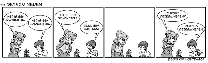 Kim: ‘Je kan planten determineren. Of dieren. Je kan zelfs auto’s of huizen determineren. Determineren is niets anders dan stap voor stap beslissen wat voor een plant (of dier, of…) je voor je hebt. In sommige gevallen kan dat erg handig zijn. Is de plant giftig of niet? Bij twijfel nooit aanraken! En wil je toch beter leren determineren? Het Natuurkwartier biedt verschillende cursussen aan!’