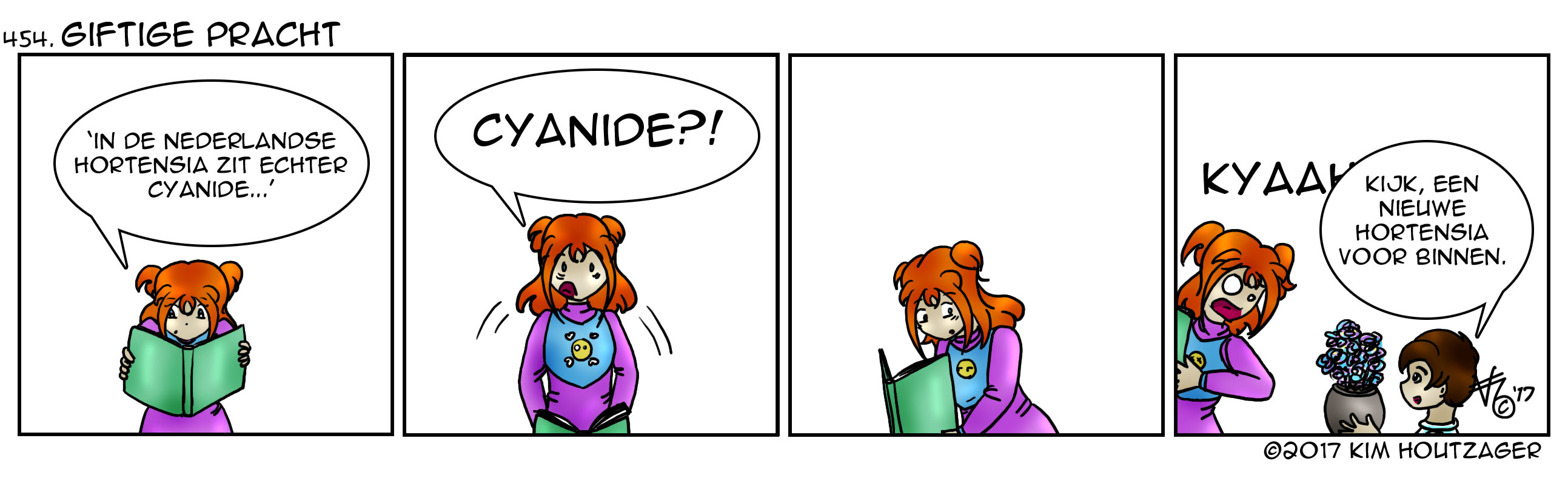 Kim: ‘Er worden Hortensia’s geroofd! Hortensia’s? Ja, Hortensia’s. Blijkbaar zijn deze tuinplanten zo populair, dat men ze rooft. En waarom? Mogelijk hebben mensen gehoord van de ‘bijzondere bijwerkingen’ (lees: je kan er high van worden) van Hortensia’s. Helaas hebben ze de tekst maar half gelezen, want dat zijn Aziatische Hortensia’s. De Nederlandse Hortensia’s bevatten cyanide. Mocht je niet weten wat dat is, dat is nogal giftig. Heel erg giftig. ‘Enkele reis’-giftig (en dan dus niet de trip waarop men hoopt). Dus ben jij de dief en hoop je op een leuk tripje? Doe het niet en neem gewoon een appel. Een stuk minder dodelijk.’