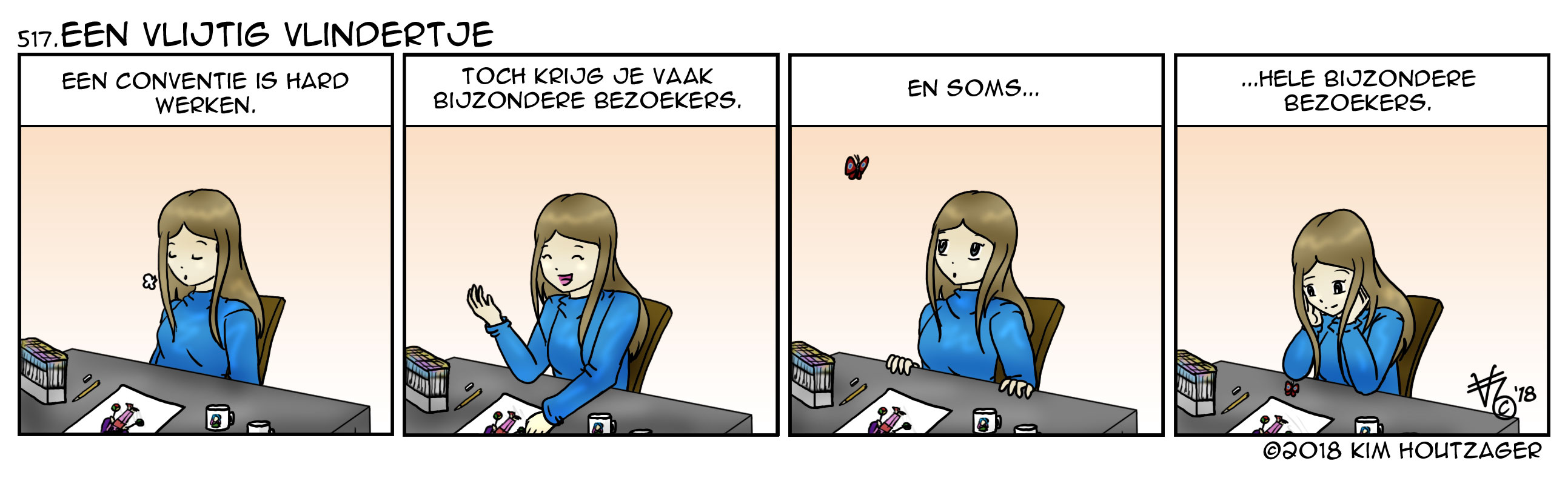 Kim: ‘Afgelopen weekend was de Dutch Comic Con. Het was een gigantisch evenement waar liefhebbers van strips, boeken, films en veel meer samen kwamen om hun passie te delen. Tussen al de filmhelden, uitgeverijen en winkels, stond ik met mijn kleine tafeltje (en dierbare crew). Het was bizar druk… en toch was er even een moment van sereniteit.’
