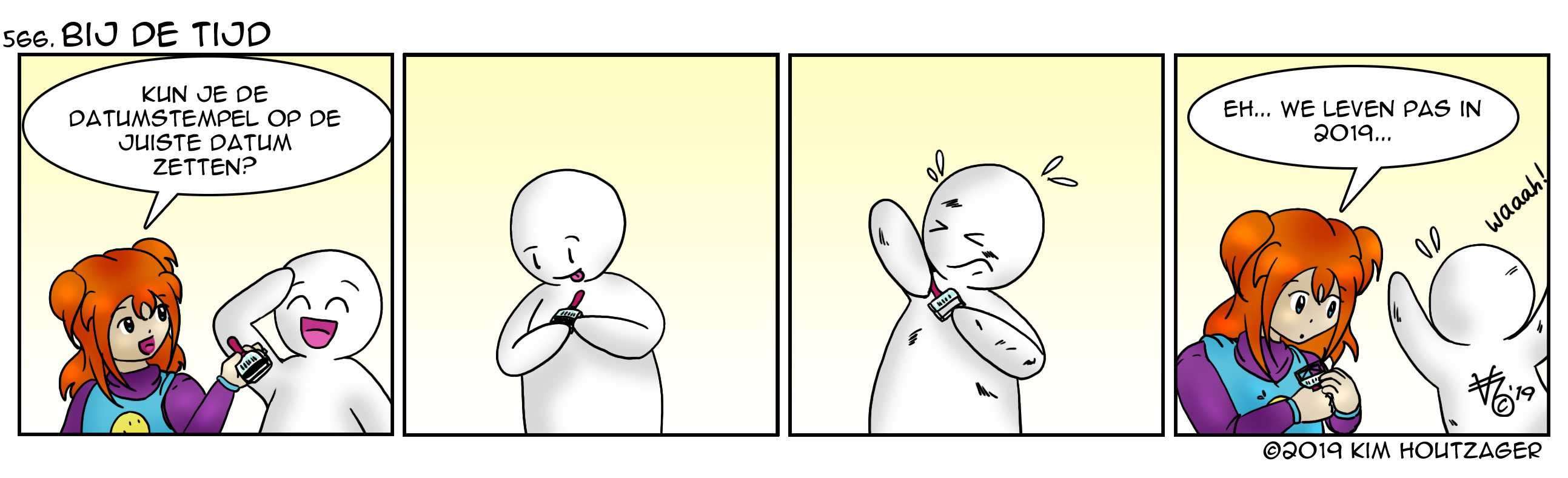 Kim: ‘De wereld wordt steeds digitaler. In plaats van brieven stuurt men mails, in plaats van op bezoek start men Facetime op. Begrijp me niet verkeerd; ik doe er even hard aan mee. Ik was daarom des te verbaasder dat bij mij op kantoor men documenten nog met een ouderwetse datumstempel van datum voorziet. Vandaag besloot ik de stempel op de juiste datum te zetten. Hoe doet men dat zonder onder de inkt te komen?!’