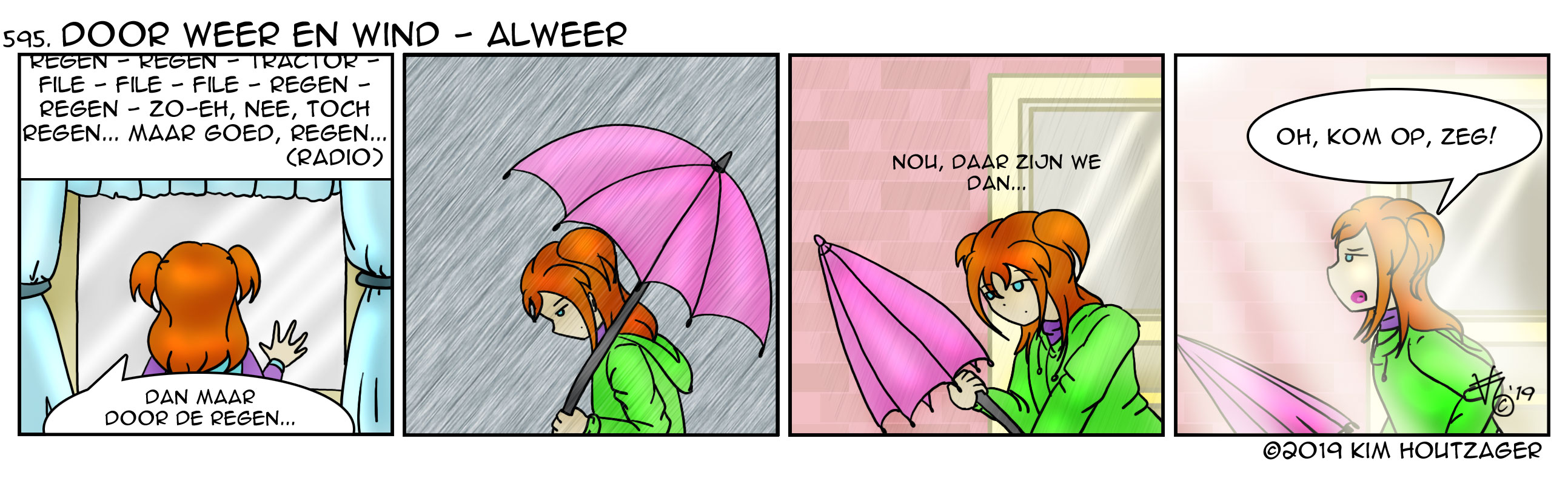 Kim: ‘De eerste dag van oktober was een een typisch Hollandse dag: regen. En file. Record-lengte, dat dan wel weer wel. Vele Nieuwegeiners kwamen die dag niet alleen laat thuis, maar ook nog eens behoorlijk nat. En als je dan eindelijk thuis bent… ‘