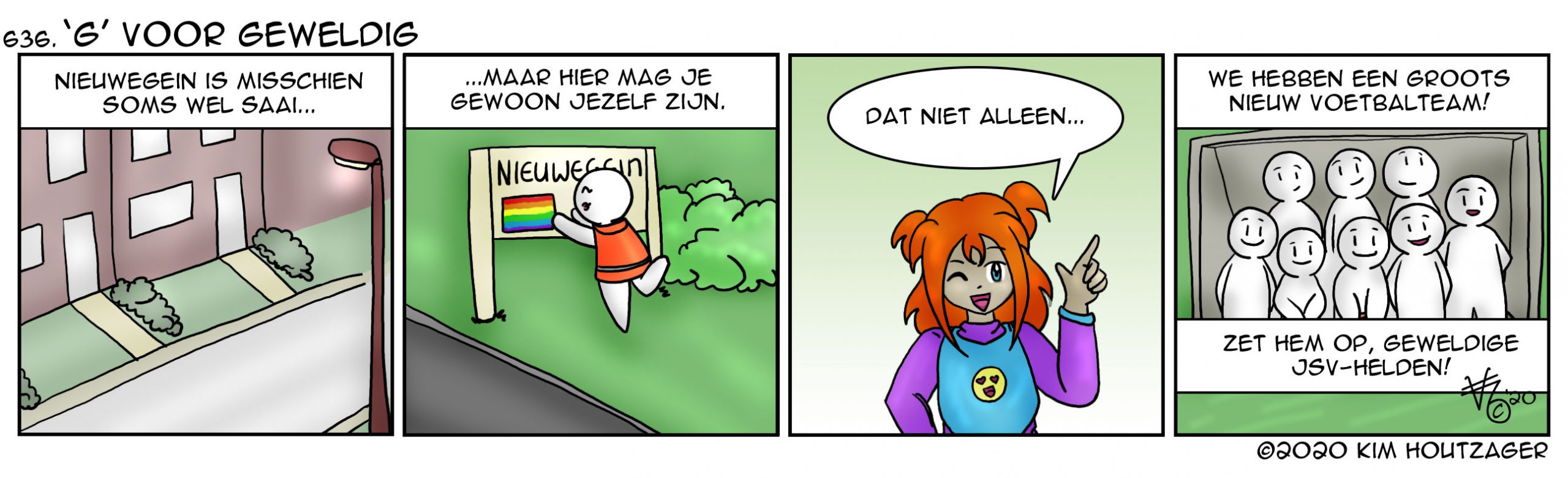 Kim: ‘Roep de krant! Wat een prachtig nieuws! Nieuwegein maakt een groots statement: hier mag je zijn wie je bent. En blijkbaar delen meer mensen die mening, want het stond zelfs op de NOS! Maar er is meer prachtig nieuws: JSV (de voetbalvereniging) is met een nieuw heldenteam begonnen: een G-team! Ze hebben in ieder geval al 1 fan!’
