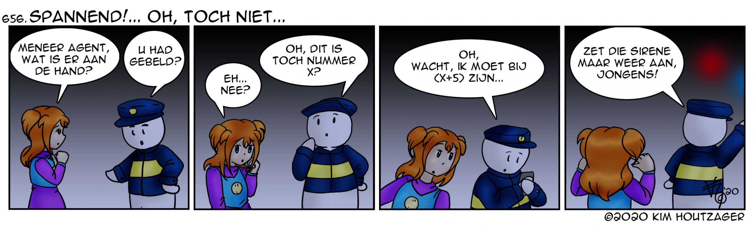 Kim: ‘Herinner je je nog strip 649? Midden in de nacht belde iemand aan om te vertellen dat ze een nieuwe baan had en dat ze mij als klant zou missen. Superleuk, natuurlijk, dat overkomt je maar één keer! Dus toen deze week weer midden in de nacht werd aangebeld… Alleen ditmaal stond de politie voor de deur! Je schrikt behoorlijk; wat is er gebeurd? Nou, gelukkig niet meer dan een typefoutje in de navigatie. Verkeerd adres!’