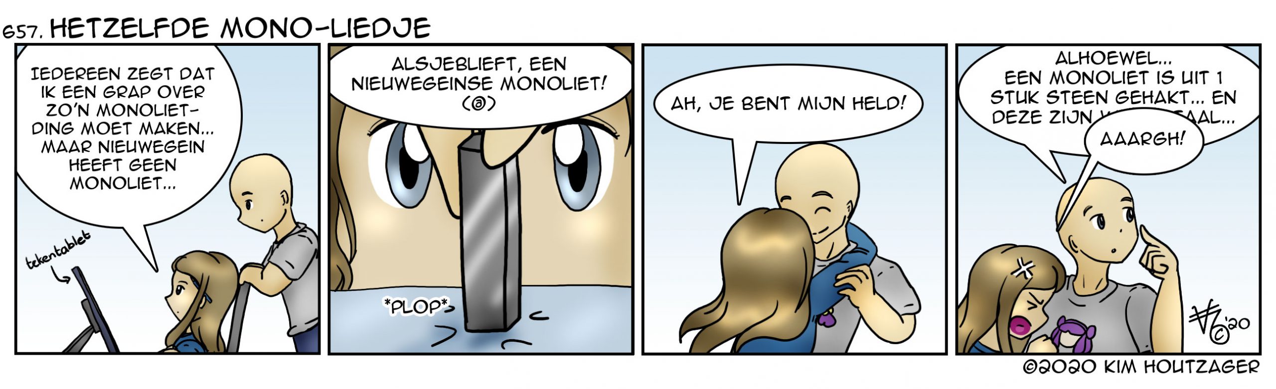 Kim: ‘De wereld is in de greep van mysterieuze monolieten. Ook in Nederland zijn deze vreemde stalen palen verschenen. Maar… niet in Nieuwegein. We hebben hier aardig wat stalen/metalen kunstwerken staan, dus een monoliet zou hier prachtig passen. Kom op, kunstenaars! Ik wil een Nieuwegeinse Monoliet! In de strip alvast een schaalmodel. Mag ook uit steen; ik sta ook open voor traditionele monolieten.’