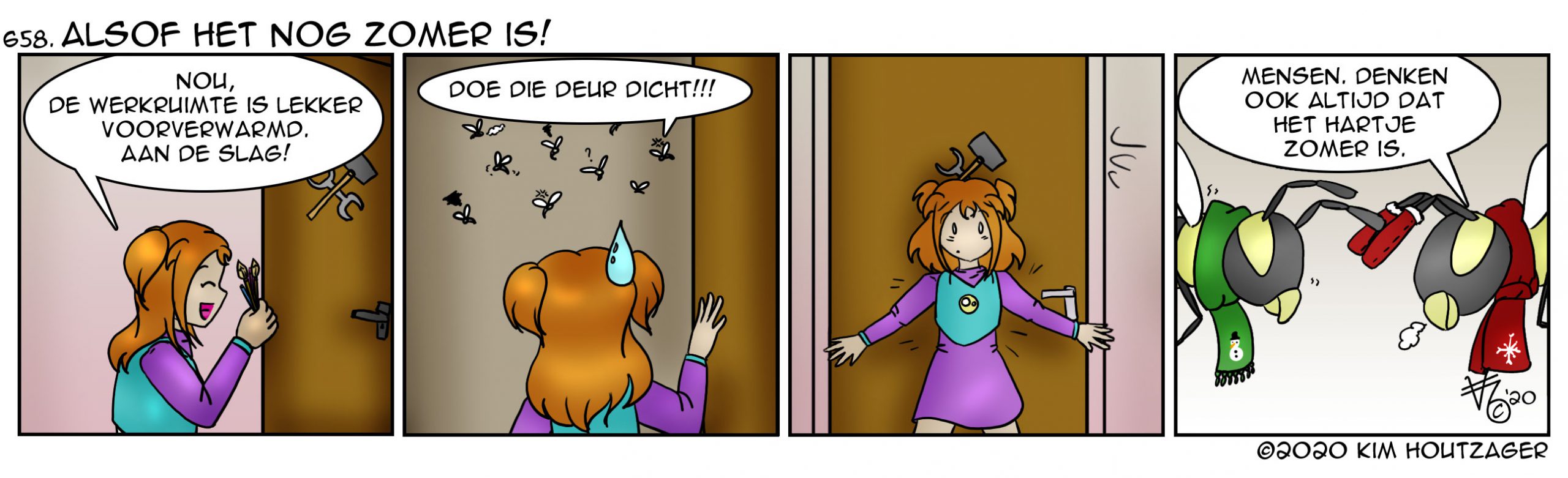 Kim: ‘Herinner je je stripje 637 nog? Zo’n 21 weken geleden ontdekte ik een wespennest bij mijn huis. We hebben besloten deze te laten zitten, want het zat op een punt waar het niemand kwaad kon. En in de herfst zouden de wespen toch vanzelf doodgaan. Maar blijkbaar zijn mijn wespen daar niet van op de hoogte. Integendeel. De laatste wespen genieten van mijn goed geïsoleerde huis en bivakkeren nu binnen. Ik leer nu heel veel over wespen!’