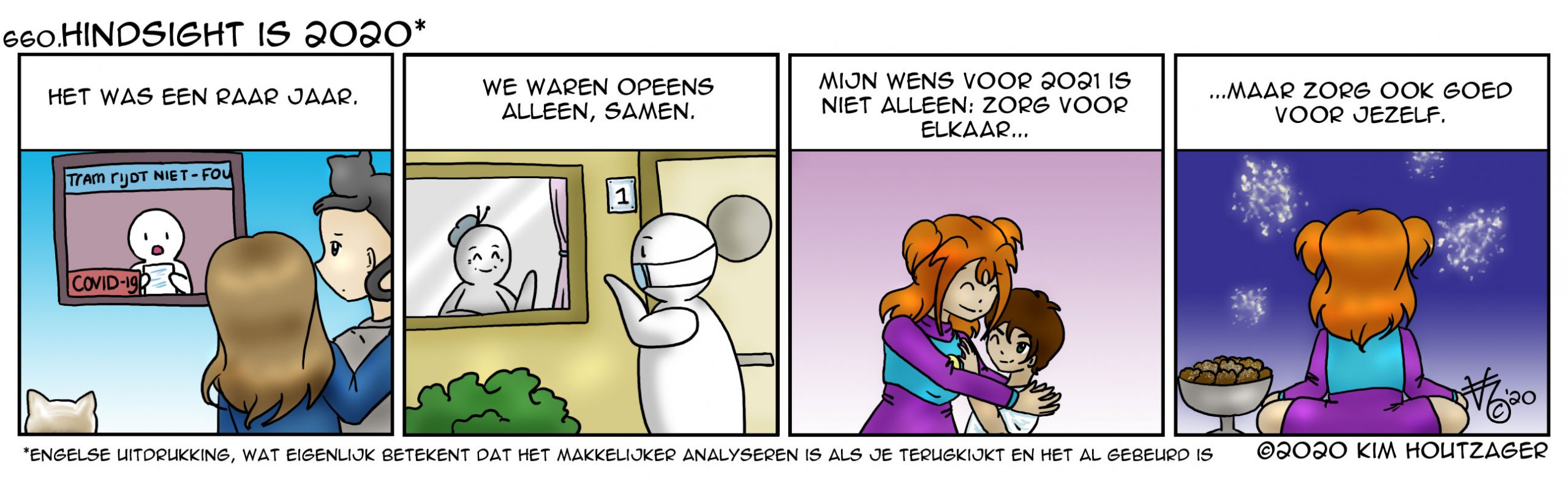 Kim: ‘2020… wat een jaar. Een jaar vol plannen, maar daar hield een zeker virus geen rekening mee. Ik heb veel over mijzelf geleerd en ik heb ook bijzondere dingen gedaan. Zo heb ik mijn eerste twee strips uitgegeven (Pen-i deel 1 en 2!) en is de Nederlandse vertaling van mijn fantasyboek uitgekomen. Oh ja, en wespen… ik heb heel veel over wespen geleerd. Op naar 2021, want ik heb nog genoeg te delen!’