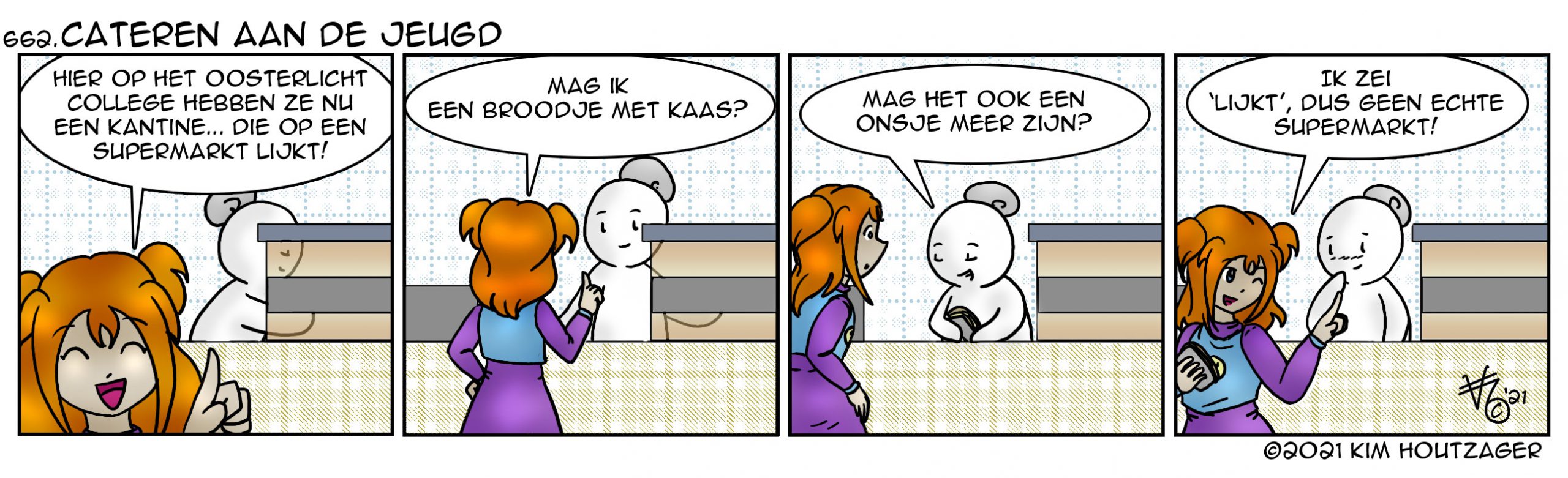 Kim: ‘Ik ga al jaren niet meer naar de middelbare school. Toch herinner ik mij onze ‘kantine’ nog levendig. Niet dat ik daar dingen haalde, want ik was zo’n braaf leerlingetje dat altijd haar eigen boterhammetjes meenam. Ik weet dus eigenlijk niet eens wat ze daar verkochten. Ik herinner me chocoladerepen en gevulde koeken… maar daar houd het wel op. Volgens mij was het niet al te gezond. Had ik er wel gekocht als ze gezonde opties hadden? Tja, naar mijn werk nam ik ook altijd mijn eigen boterhammen mee… Nu ik thuis werk smeer ik ook tussen de middag brood. Wat hebben mijn lezers eigenlijk met de lunch?’