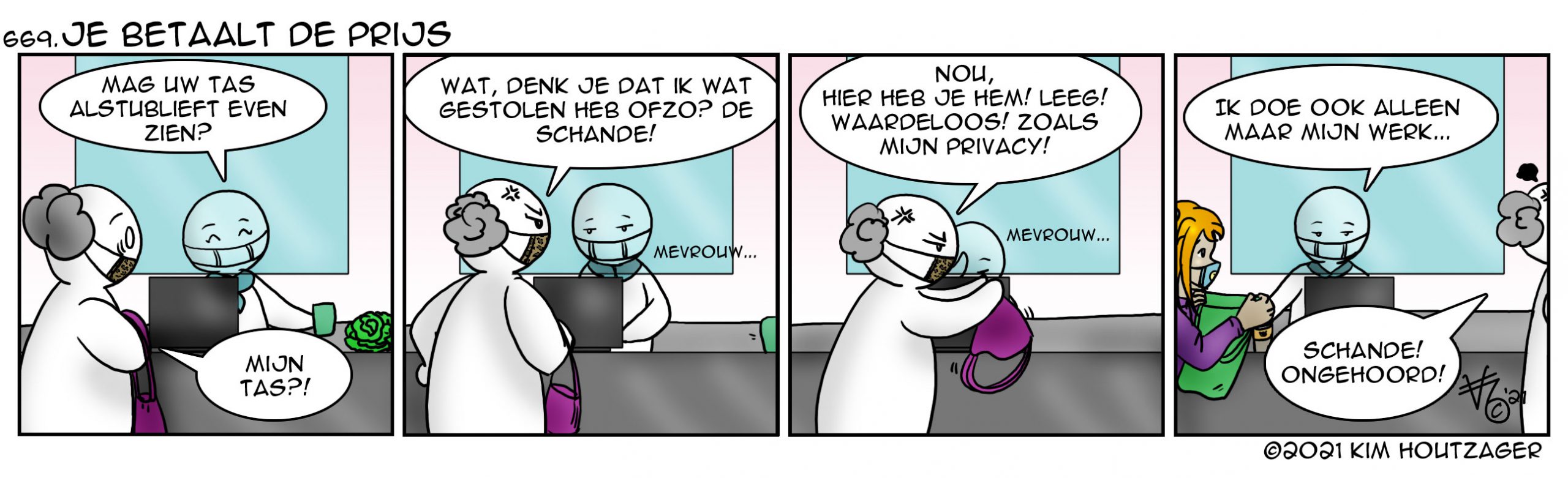 Kim: ‘Als ik bij mijn supermarkt binnen stap, dan staat er vooraan een groot bord met ‘er vindt tassencontrole plaats’. Bij de kassa wordt mij dan ook steevast gevraagd om in mijn tas te mogen kijken. Voor mij geen probleem: de supermarkt is mijn enige stop van die dag, dus mijn tas is leeg. Toch zijn er mensen die dit een inbreuk op de privacy vinden. De wettelijke grondslag laat ik achterwege… wat vind jij?’