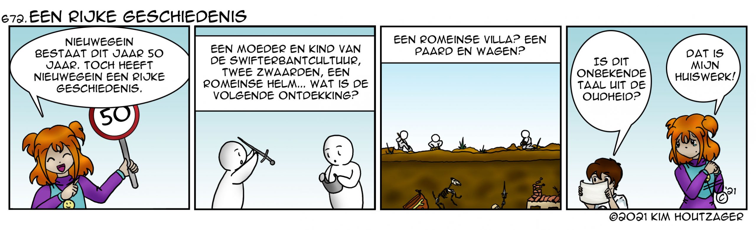 Kim: ‘Een nieuwe ontdekking in Nieuwegein! Er is een Romeinse helm gevonden. Het zit nu nog vast in een brok klei, maar heel voorzichtig wordt de klei weggehaald. Hoe zal de helm er uit zien? En wat was zijn doel? Verloren in de strijd of wellicht voor een ritueel? Dat roept om een verhaal!’