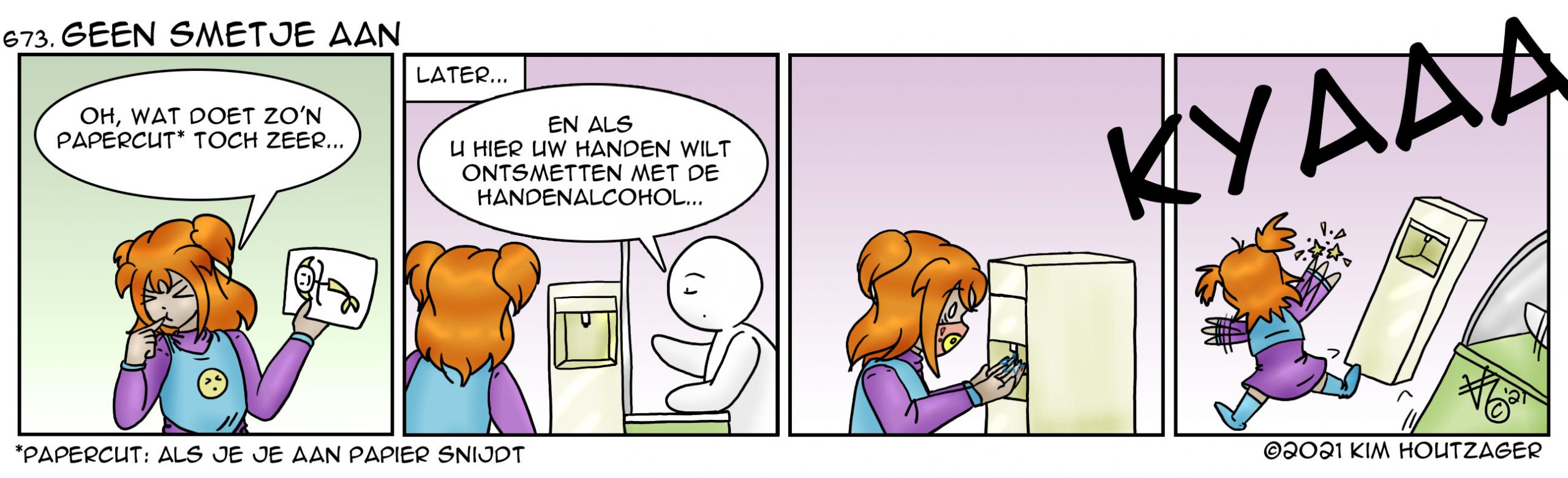 Kim: ‘We zijn het al gewend om bij binnenkomst (waar dan ook) onze handen te ontsmetten. Een goede zaak. Echter, van de week had ik mij aan een velletje papier gesneden. Gewoon, zo’n superklein sneetje. En daarna kwam de handenalcohol er overheen. Heel pijnlijk!’