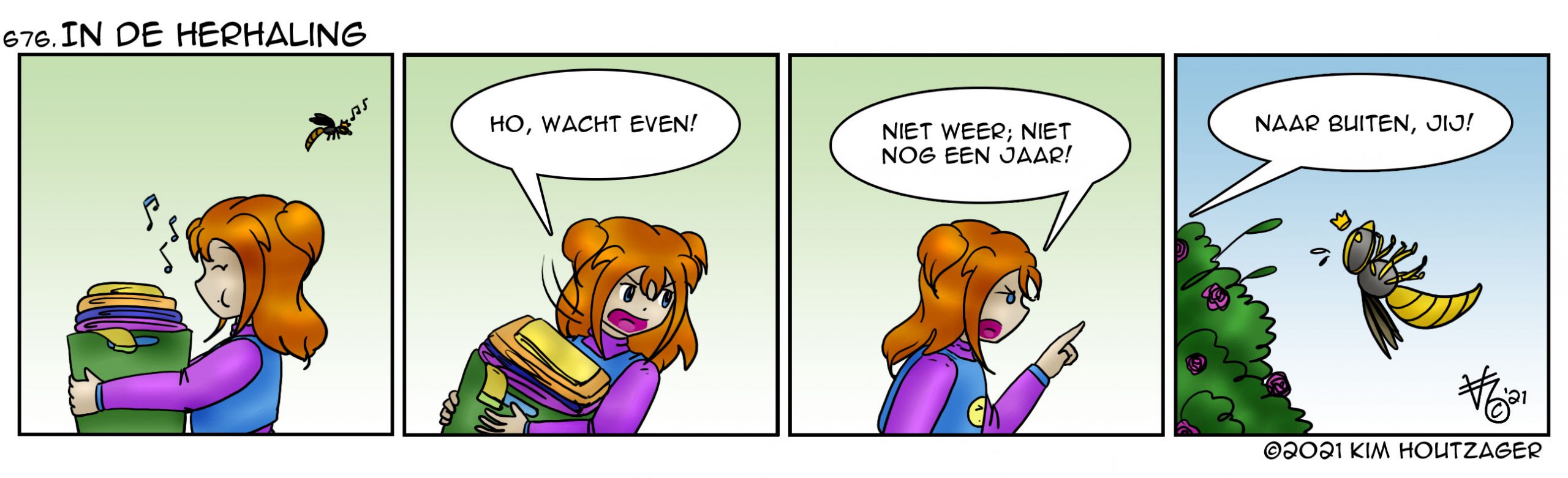Kim: ‘Herinner je het je nog? In 2020 kwam een zeker onderwerp vaak voorbij: wespen. Ik had een wespennest aan mijn werkruimte waar ik de strip teken. Na lang wachten was het nest eindelijk uitgestorven. Eindelijk geen wespen meer! Deze week vloog er opeens een wesp door onze woning. Was het een koningin? Ik heb geen risico genomen! Naar buiten!’
