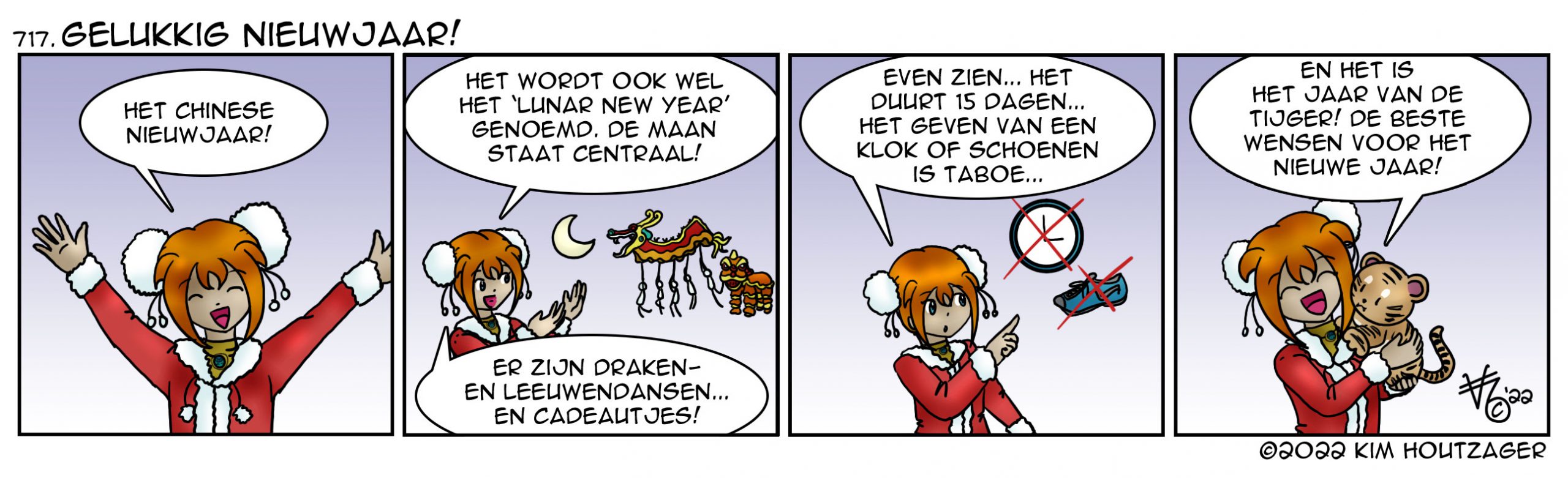 Kim: ‘Het Chinese Nieuwjaar! Ook dit jaar wordt het in Nederland weer sober gevierd. Zonde, want het is een prachtfeest! Voor het maken van deze strip heb ik veel informatie opgezocht… en wat ik wist, was nog maar het topje van de ijsberg! Het draait om familie, elkaar geluk wensen en symboliek. Dit jaar is het jaar van de tijger. Dat doet me aan een uitdrukking denken… Zet hem op, tijger!’