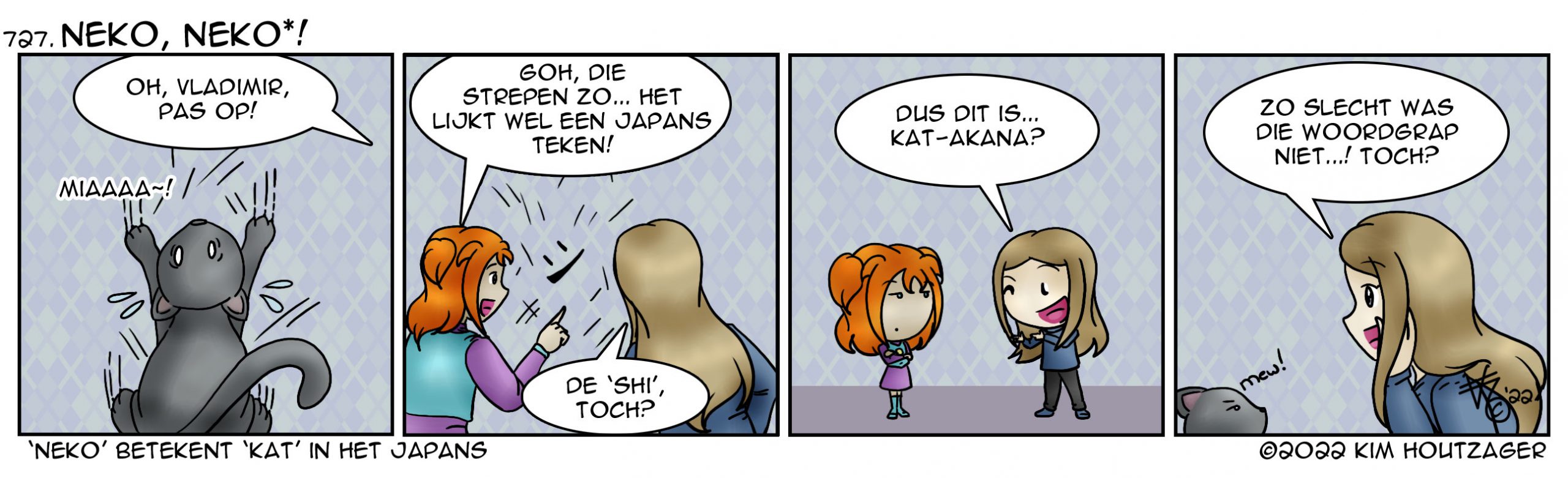 Kim: ‘Ik ben dol op woordgrappen. Vroeger had ik niets met taal, maar tegenwoordig steeds meer. Ook heb ik wat met de Japanse taal, al blijft daar na jaren oefenen niets van plakken. Eén van de Japanse schriften heet katakana. Toen Vladimir de kat per ongeluk wat krassen maakte, zag ik daar een Japans teken in. Schrijft mijn Blauwe Rus nu ook al Japans?’