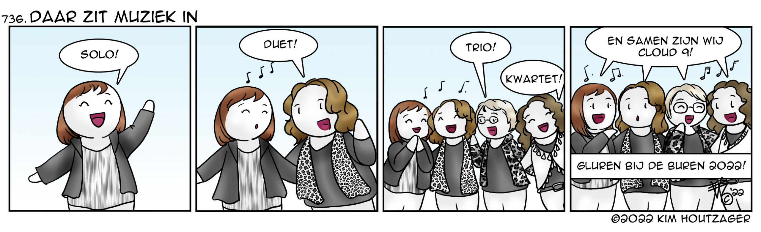Kim: ‘ 3 juli, Gluren bij de Buren. Schrijf het in je agenda! Ook in mijn studio mag ik weer een act hosten. Ditmaal mag ik Cloud 9 verwelkomen, een Barbershop Quartet! Dat mag je niet missen! Meer informatie: https://glurenbijdeburen.nl/nl/informatie/programma#186 (Appelvink 1L, om 14:30, 16:00 en 17:30 uur). Gratis toegang en natuurlijk kun je ook de Pen-i strips in de studio kopen!’