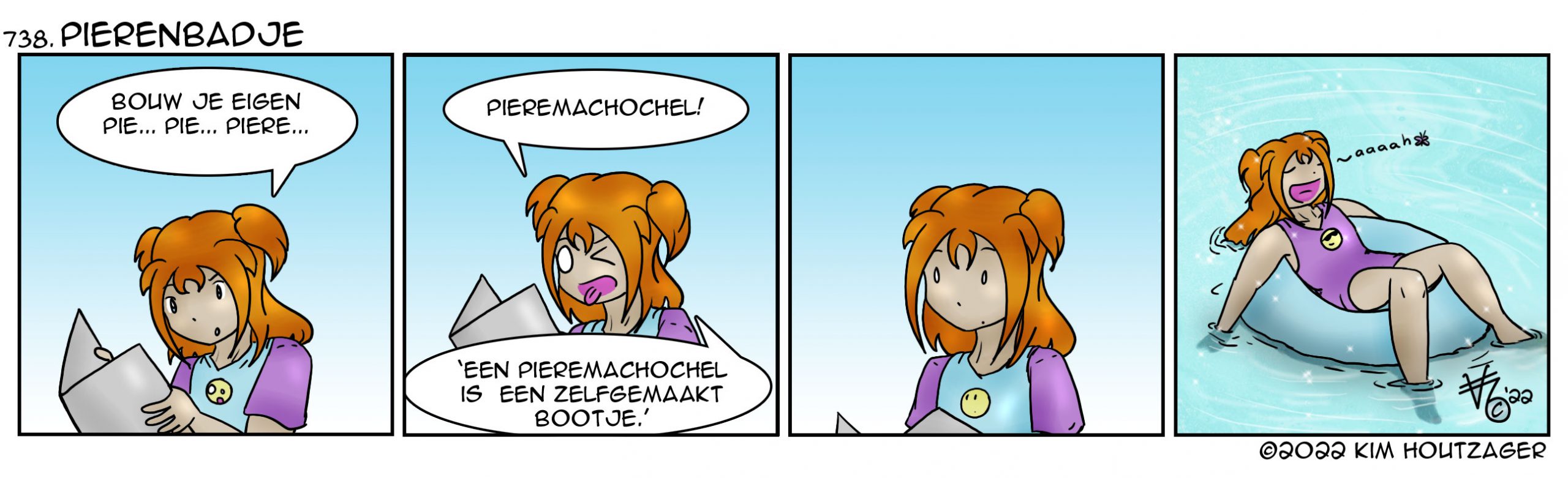 Kim: ‘Als het niet regent, is het prachtig zomers weer. Dan wil je toch niets liever dan verkoeling aan of in het water zoeken? Bouw daarom je eigen pieremachochel. Een pieremachochel? Ja, een pieremachochel. En laten we ook maar hopen op een mooie nazomer, zodat je na veel testvaren je creatie kan laten zien op de 12e Authentieke dag in Vreeswijk.’
