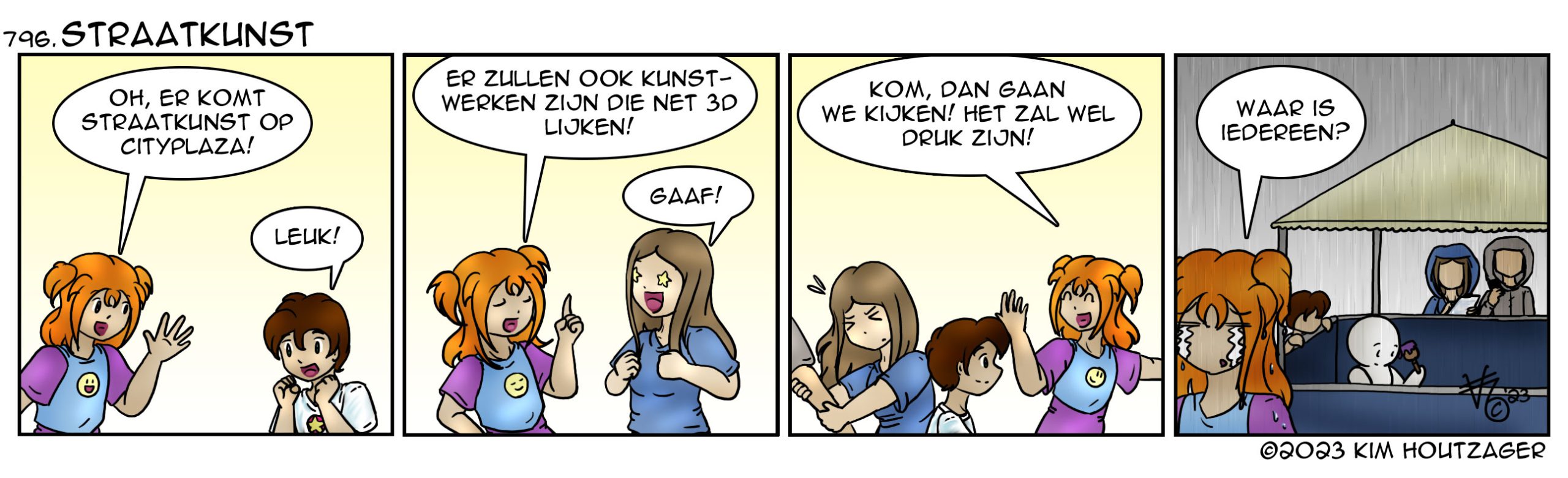 Kim: ‘Er was iets bijzonders georganiseerd voor Cityplaza: straatkunst. Artiesten van overal en nergens kwamen om Cityplaza te omhelzen met hun kunst. Ik heb al een paar werken ontdekt en… het is prachtig. Als nou die stomme regen ophield, konden er meer mensen van genieten!’