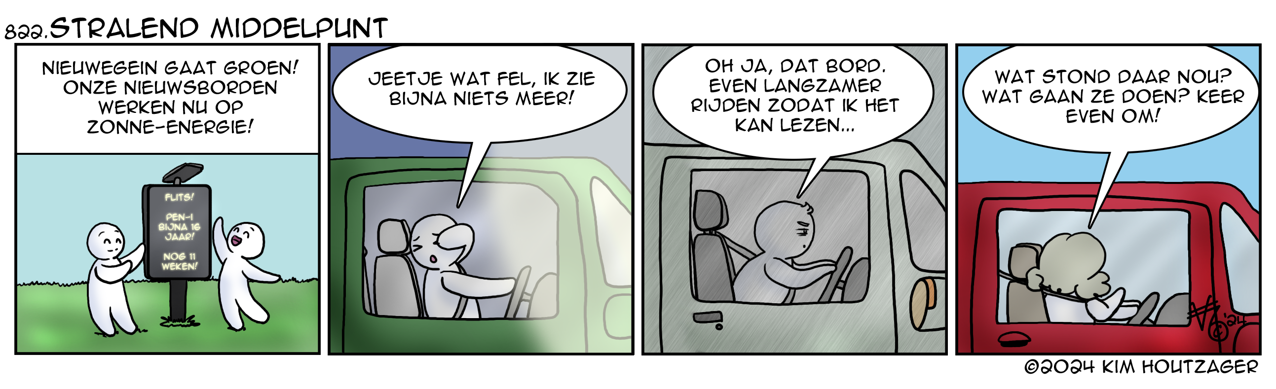 Kim: ‘Onze nieuwsborden worden nog groener! Niet qua kleur, maar qua energieverbruik. Kleine zonnepaneeltjes zullen onze informatieborden van energie voor het licht en de animaties voorzien. Maar als ik eerlijk ben… vind ik die dingen maar wat afleidend. Ik snap waarom ze er staan, maar verkeersveiligheid is ook belangrijk.’