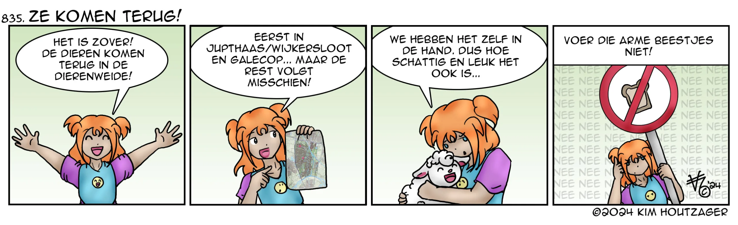 Kim: ‘Goed nieuws, iedereen! De dieren komen terug naar de dierenweides! Het is echter een test en nog nooit had Nieuwegein zoveel invloed op de uitkomst. Om te zorgen dat alle weides weer gevuld worden… moeten we niets doen. Alleen kijken, genieten, maar zeker niet voeren. Want als iedereen een sneetje brood of wortel geeft… worden onze schapen en geiten weer snel doodziek!’