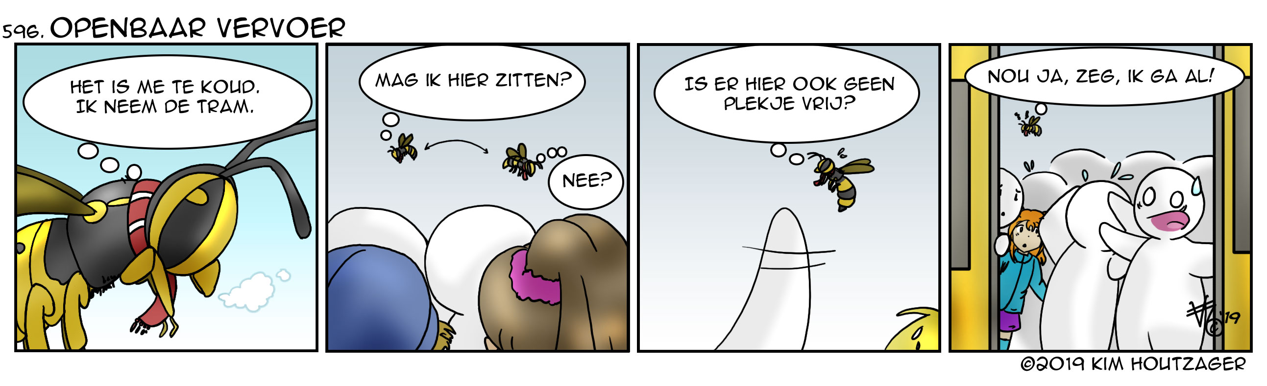 Kim: ‘De dagen worden kouder en dat merkt de natuur ook. Beestjes trekken naar binnen, voor de warmte. Stel je nu een overvolle tram voor en… een wesp die een halte meereist. Heeft hij ingecheckt? Of heeft hij zwart gereden? In ieder geval hebben een aantal passagiers toch wel peentjes gezweet!’