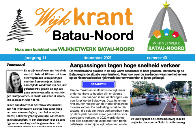 De december wijkkrant voor de bewoners in Batau-Noord is weer uit. Mocht u hem gemist hebben, kwijtgeraakt zijn of gewoon even op uw computerscherm willen lezen, de wijkkrant van uw buurt staat hier nu ook altijd on-line. U vindt overigens hier al het verdere nieuws over uw wijk.